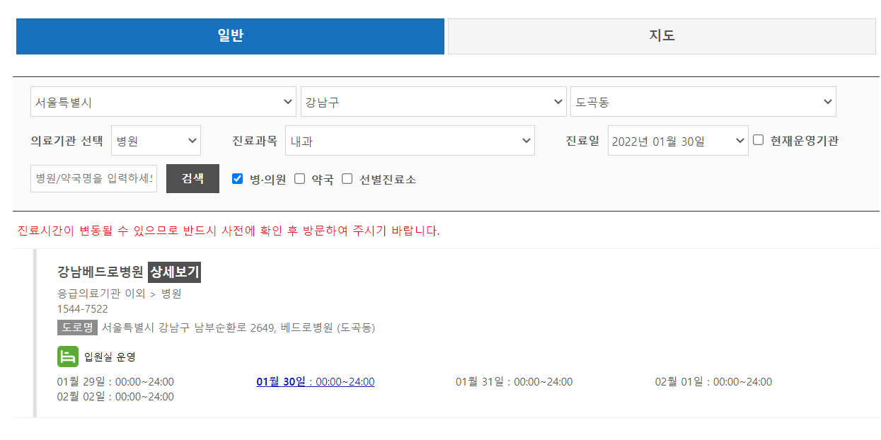지역만 넣고 검색을 해 보았더니 이렇게 해당 지역에 영업을 하는 병원, 약국 등이 검색이 되었어요. 날짜별로 영업시간이 나와있으니 참고하시면 되지만, 혹 정보가 맞지 않는 경우도 있으니 같이 기재되어있는 전화번호로 꼭 전화를 해보시고 방문하시는 것을 추천드립니다.