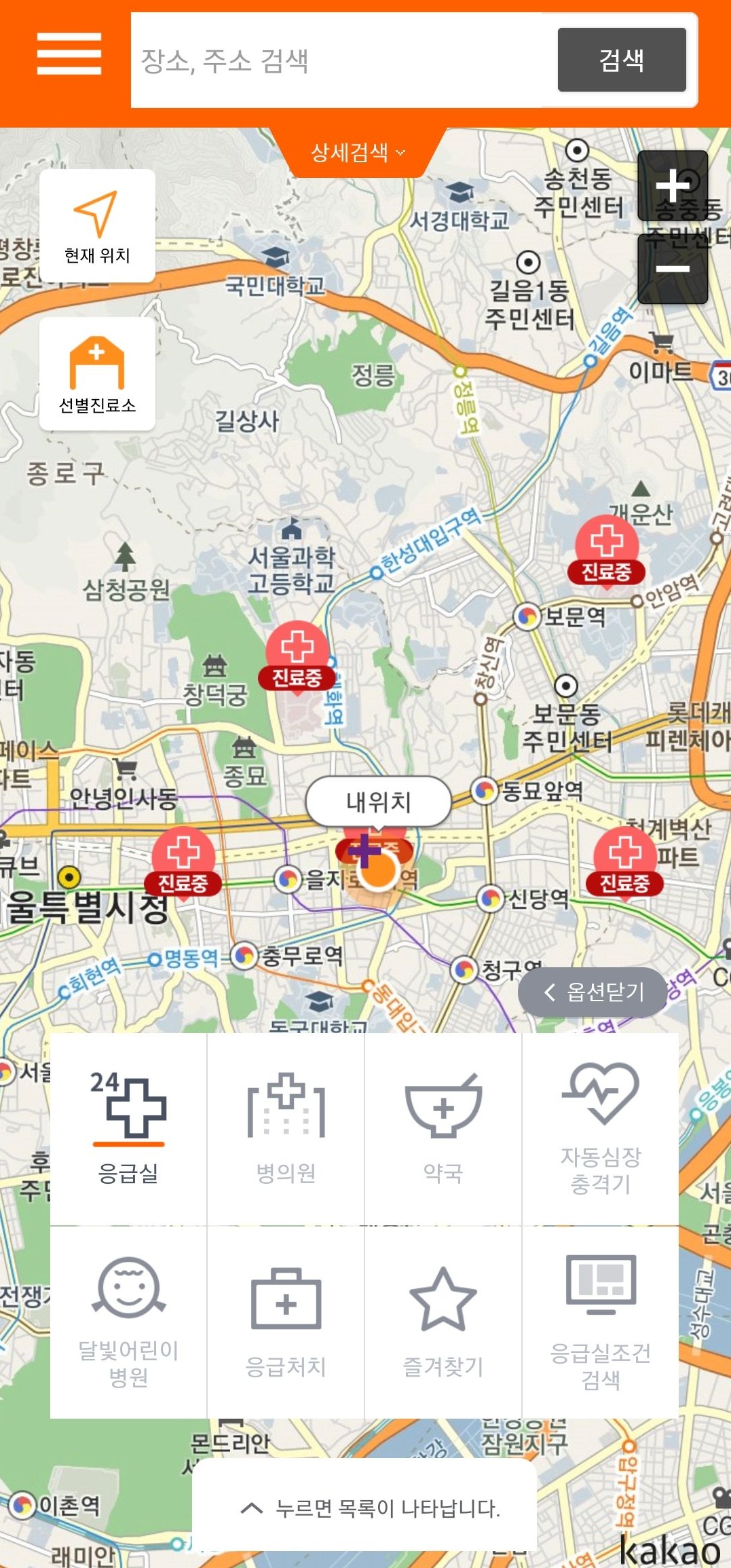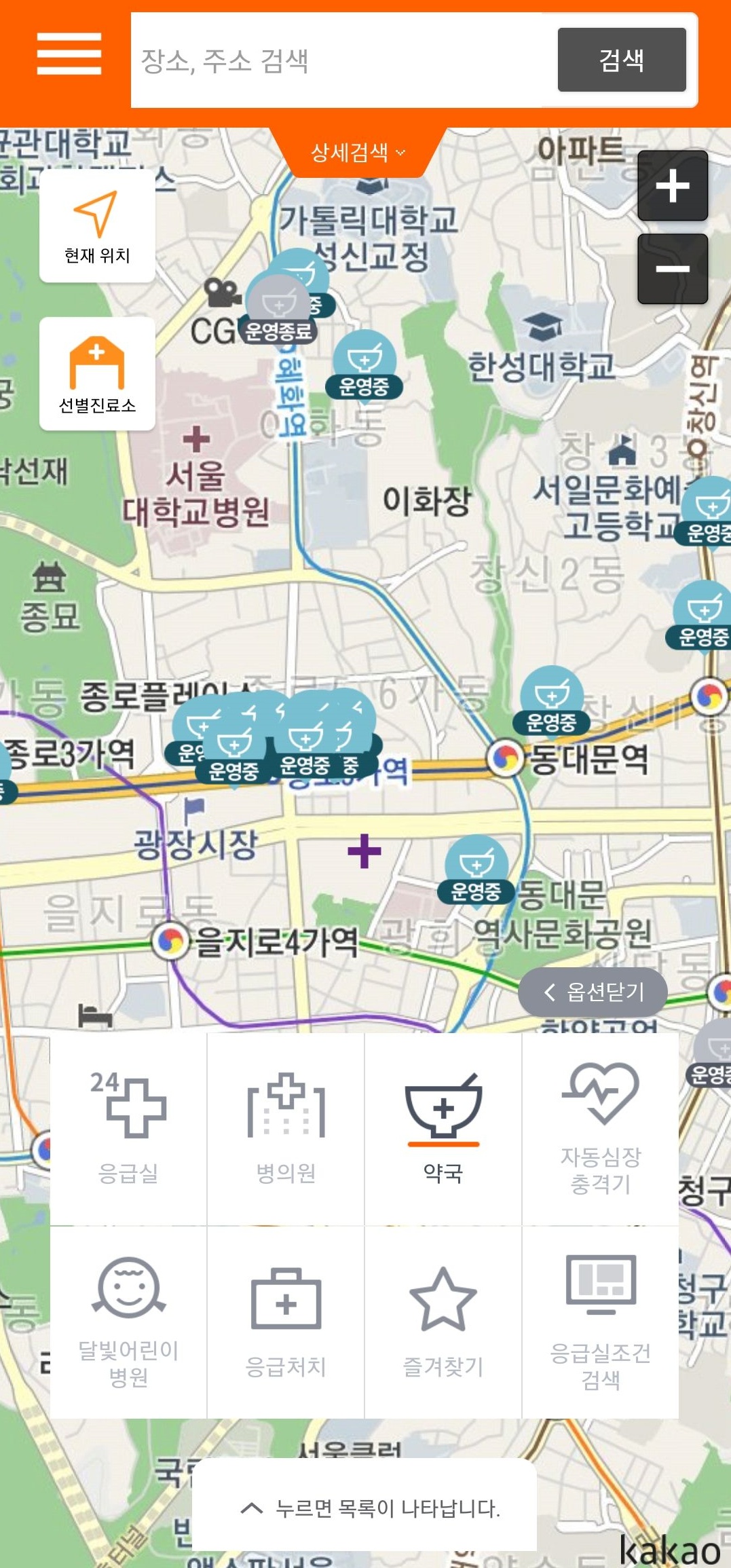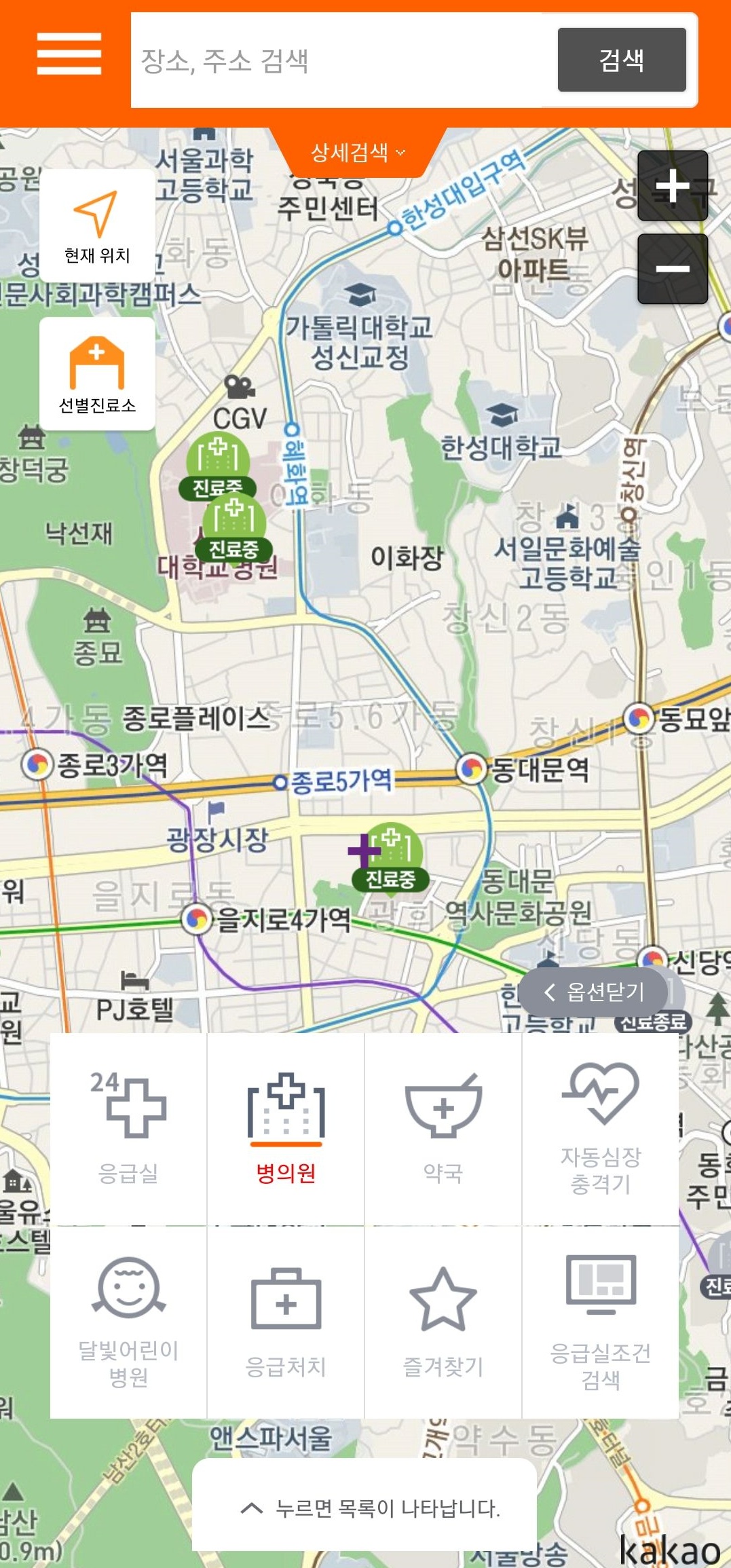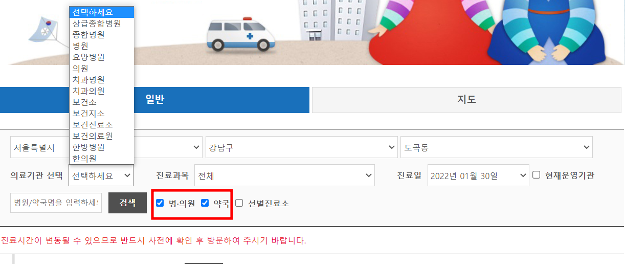 일단 기본적으로 지역만 선택하시고 검색 버튼을 누르시면 해당 지역에 해당하는 병원, 약국 등 모든 의료기관 정보가 뜨니까요, 카테고리 선택이 애매한 경우 지역 설정만 하시고 검색 버튼을 눌러보세요.