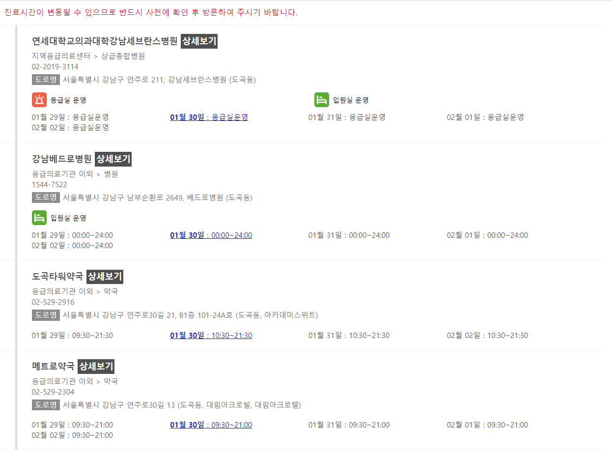지역만 넣고 검색을 해 보았더니 이렇게 해당 지역에 영업을 하는 병원, 약국 등이 검색이 되었어요. 날짜별로 영업시간이 나와있으니 참고하시면 되지만, 혹 정보가 맞지 않는 경우도 있으니 같이 기재되어있는 전화번호로 꼭 전화를 해보시고 방문하시는 것을 추천드립니다.
