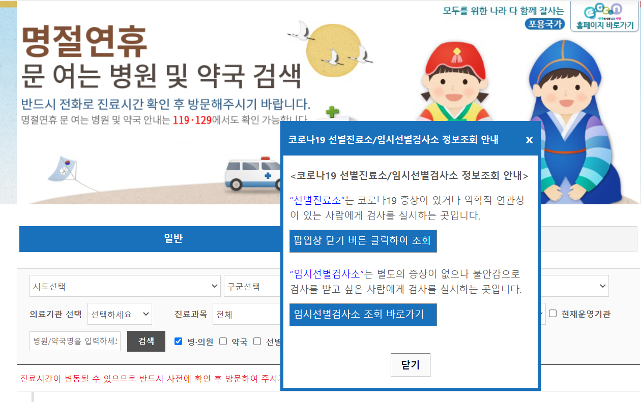 응급의료포털 e-gen 홈페이지에서는 설날 문여는 병원, 약국 정보뿐 아니라 선별진료소와 임시선별검사소 정보 또한 조회가 가능하다는 점도 참고 해 주세요. 홈페이지에 접속하면 따로 어떤 메뉴로 들어갈 필요 없이 첫화면에서 바로 검색이 가능합니다.