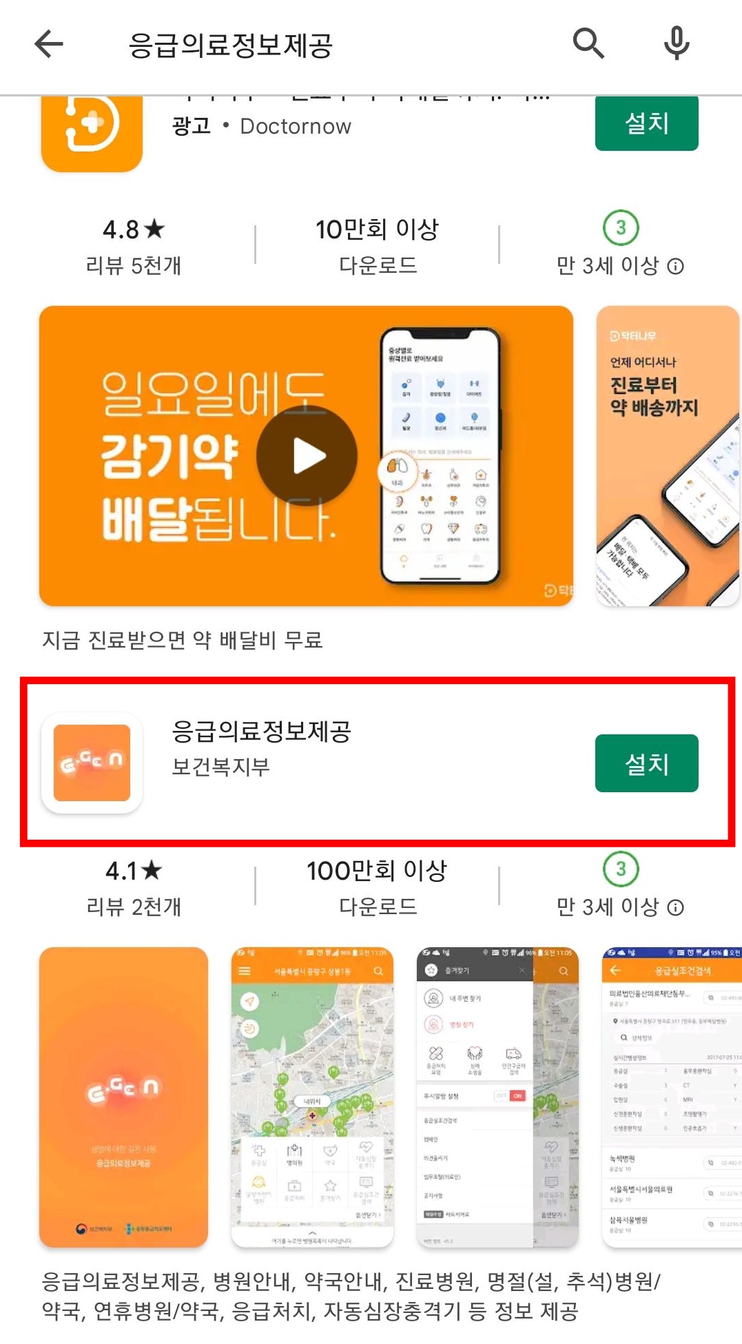 응급의료정보제공 어플은 보건복지부에서 만든 어플이니 믿고 다운받으셔도 될 것 같아요. 앱스토어에 응급의료정보제공 이라고 검색하시면 위에 보이듯이 주황색으로 된 어플 하나를 발견하실 수 있을거에요. 현재 플레이스토어에 검색해보니 맨 위에는 다른 어플이 나오고 두번째에 나타나고 있으니 어플 이름을 잘 확인하고 다운받아주세요.