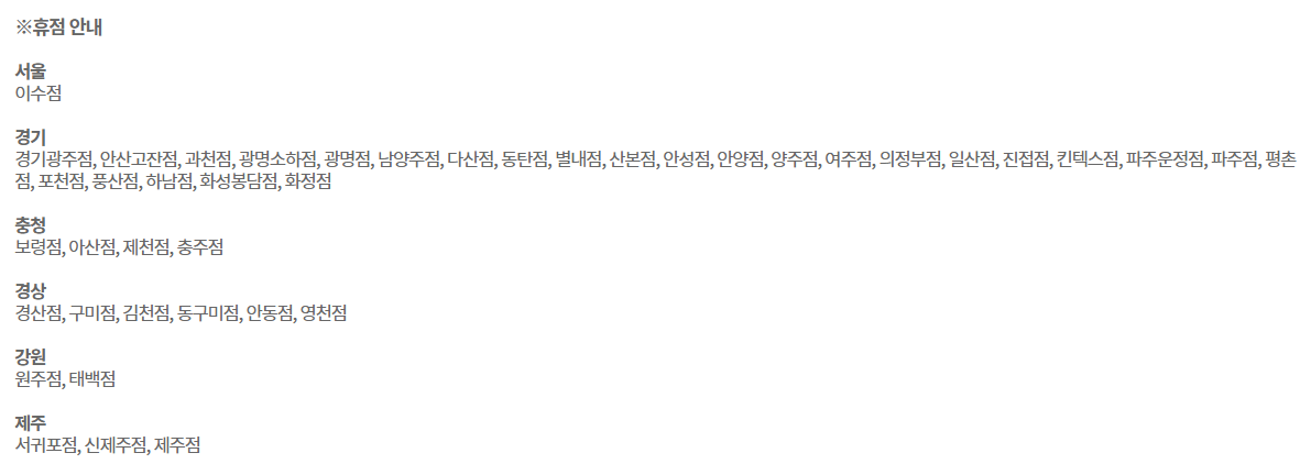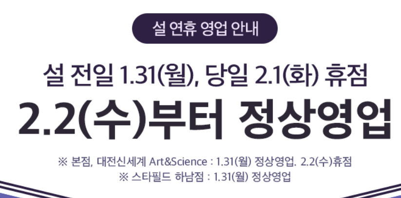 하지만 일부 지점의 경우 휴무일이 다른데요, 분당점, 센텀시티점, 마산점 이렇게 세 곳은 1월 31일 월요일은 정상영업을 하고 2월 1일 화요일과 2월 2일 수요일 휴무입니다.
