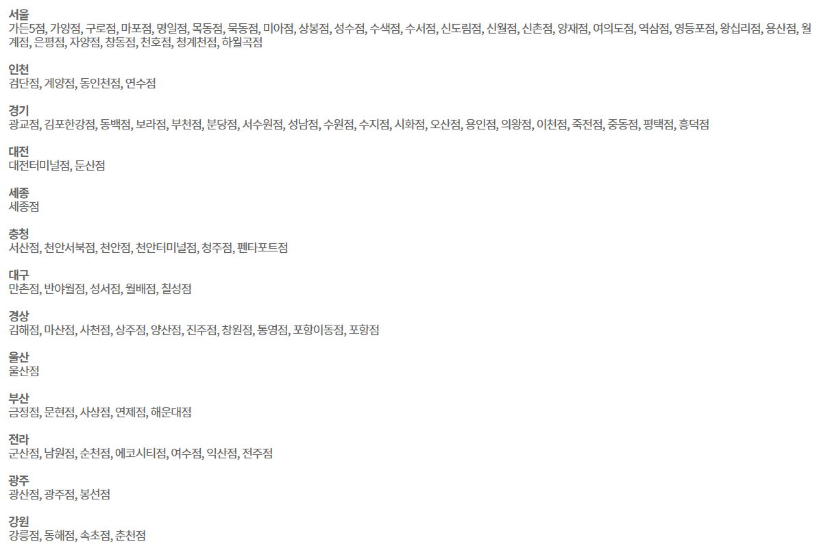 - 충남 : 당진점, 아산터미널점, 홍성점
