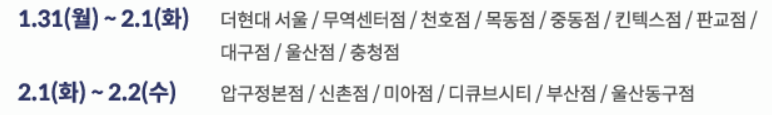 2월 2일 영업하는 지점 : 더현대 서울, 무역센터점, 천호점, 목동점, 중동점, 킨텍스점, 판교점, 대구점, 울산점, 충청점