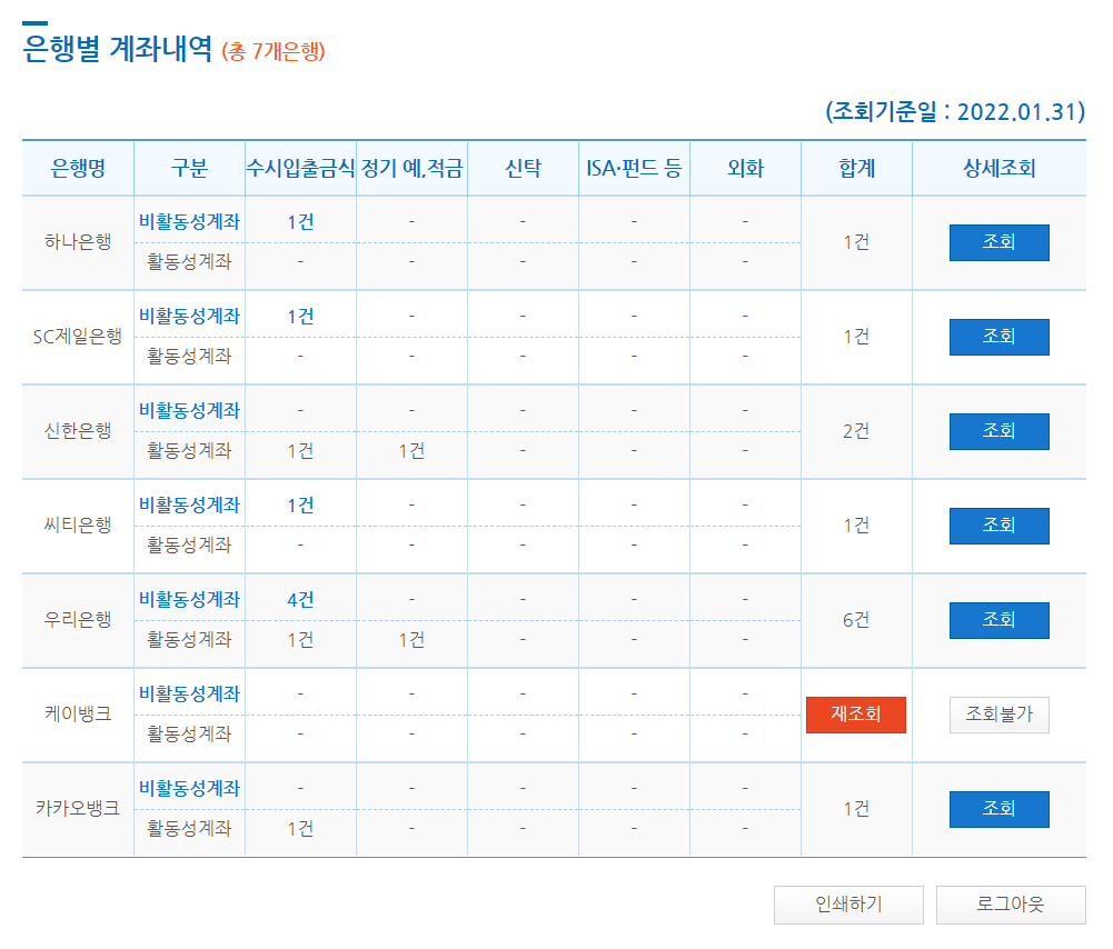 인증을 하자마자 바로 본인의 명의로 등록되어있는 은행들과 계좌들의 리스트가 쭉 뜨게 되는데요. 저도 조회를 해보니 생각지도 못한 계좌들이 굉장히 많이 있더라구요. 여기서 비활동성계좌는 휴면계좌로 한동안 사용하고 있지 않아서 휴면 상태로 전환된 계좌를 말하고, 활동성계좌는 현재 정상적으로 사용중인 계좌를 말해요. 각 은행별로 우측의 조회 버튼을 누르시면 해당 은행의 계좌에 대한 좀 더 자세한 정보를 확인하실 수 있어요.
