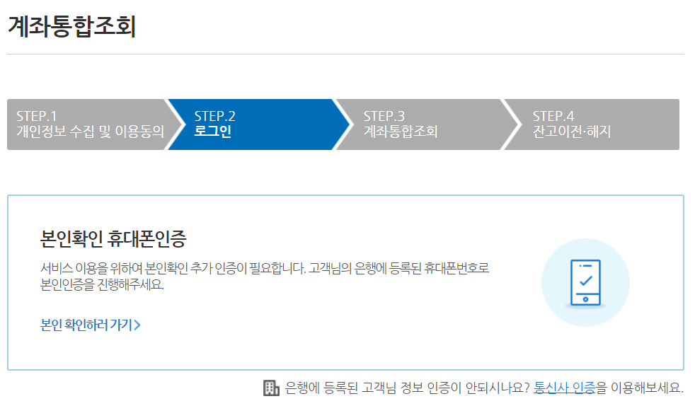 금융인증서나 공동인증서로 로그인만 하면 끝이 아니라 그 다음 단계로 휴대폰 인증 과정도 필요해요. 본인 확인하러가기 버튼을 클릭 후 휴대폰을 이용한 본인인증을 진행해주세요.