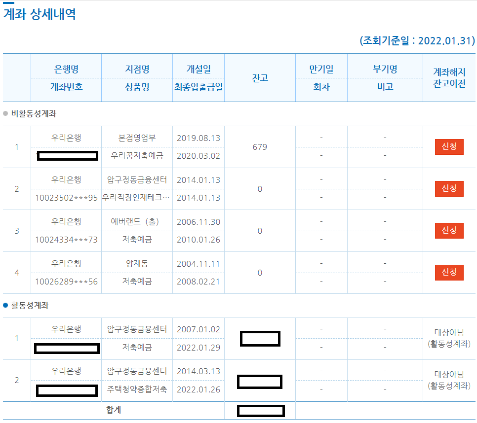 조회 버튼을 누르시면 이처럼 본인의 명의로 된 계좌에 대한 보다 자세한 정보를 확인하실 수 있어요. 각 계좌에 얼마씩 들어있는지 잔고 확인 또한 가능하구요. 또 불필요하게 계좌가 여러개 있는 경우 한 번 정리해 주는 것도 좋을 것 같은데요, 이 사이트에서 바로 계좌 해지 신청도 가능해요. 우측에 계좌해지잔고이전 신청 버튼을 누르시면 남은 잔고를 다른 통장으로 이전하는 동시에 계좌를 해지시키는 것 또한 가능합니다.