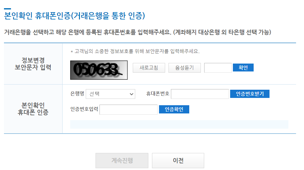 여기서 휴대폰 인증 방법은 다른 일반적인 사이트들의 휴대폰 본인인증 과정과 살짝은 다른데요. 먼저 정보보호를 위해 보안문자를 그대로 입력하신 뒤 확인 버튼을 눌러주세요. 그리고 나서 본인확인 휴대폰 인증을 진행해주시면 되는데요. 주거래은행을 선택하시고 해당 은행에 본인의 휴대폰번호로 등록되어있는 휴대폰번호를 입력하신 뒤 인증번호받기 버튼을 클릭해주세요.
