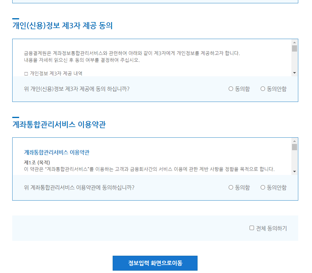 첫번째 단계로 개인정보 수집 및 이용동의를 하셔야 하는데요, 전체 동의하기 체크박스에 체크를 해 주신 뒤 정보입력 화면으로 이동 버튼을 클릭 해 주세요.