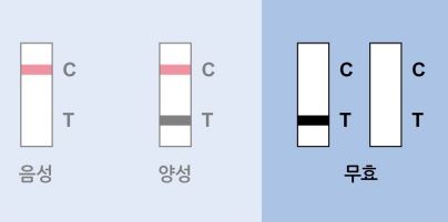 검사 결과는 총 네 가지가 나올 수 있는데요. 먼저 C 부분에 한 줄이 나타나면 음성입니다. 두 줄 다 나왔을 경우에만 양성이구요. 다만 한 줄이 나왔는데 시험선(T) 에만 선이 나타났다면 무효이기때문에 다시 검사를 진행하셔야 하고, 선이 아예 나타나지 않아도 마찬가지로 무효입니다.