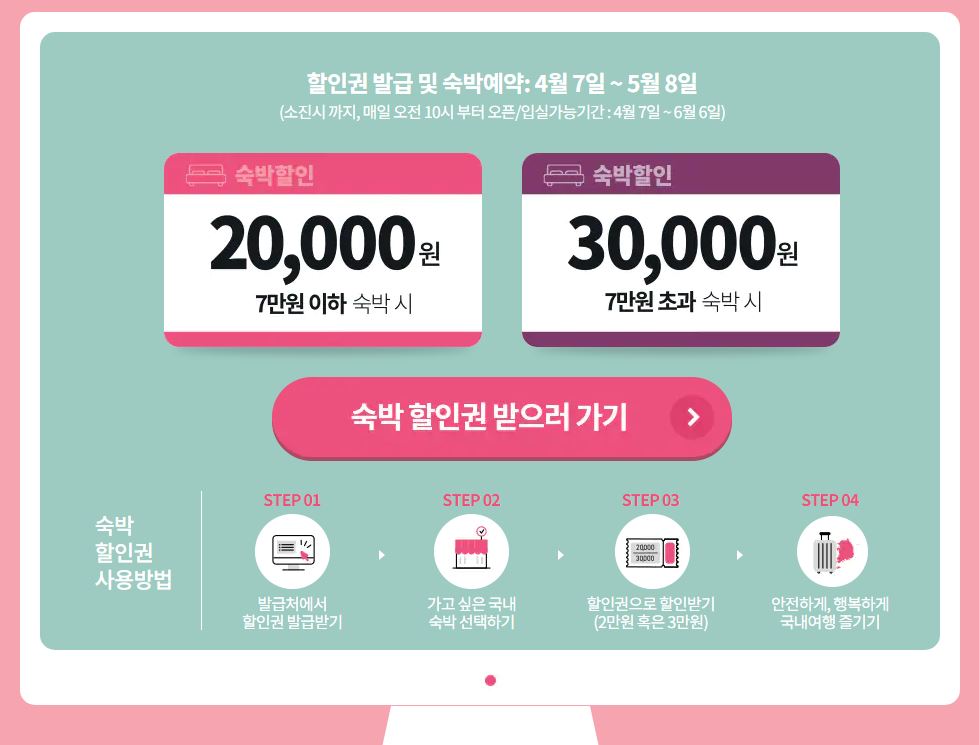 전국 숙박 할인권 발급 기간은 4월 7일 목요일부터 5월 8일 일요일까지 약 한달간 입니다. 1인당 1회 발급이 가능하며 선착순이기 때문에 소진 전에 빠르게 발급 받는 것이 좋겠죠.