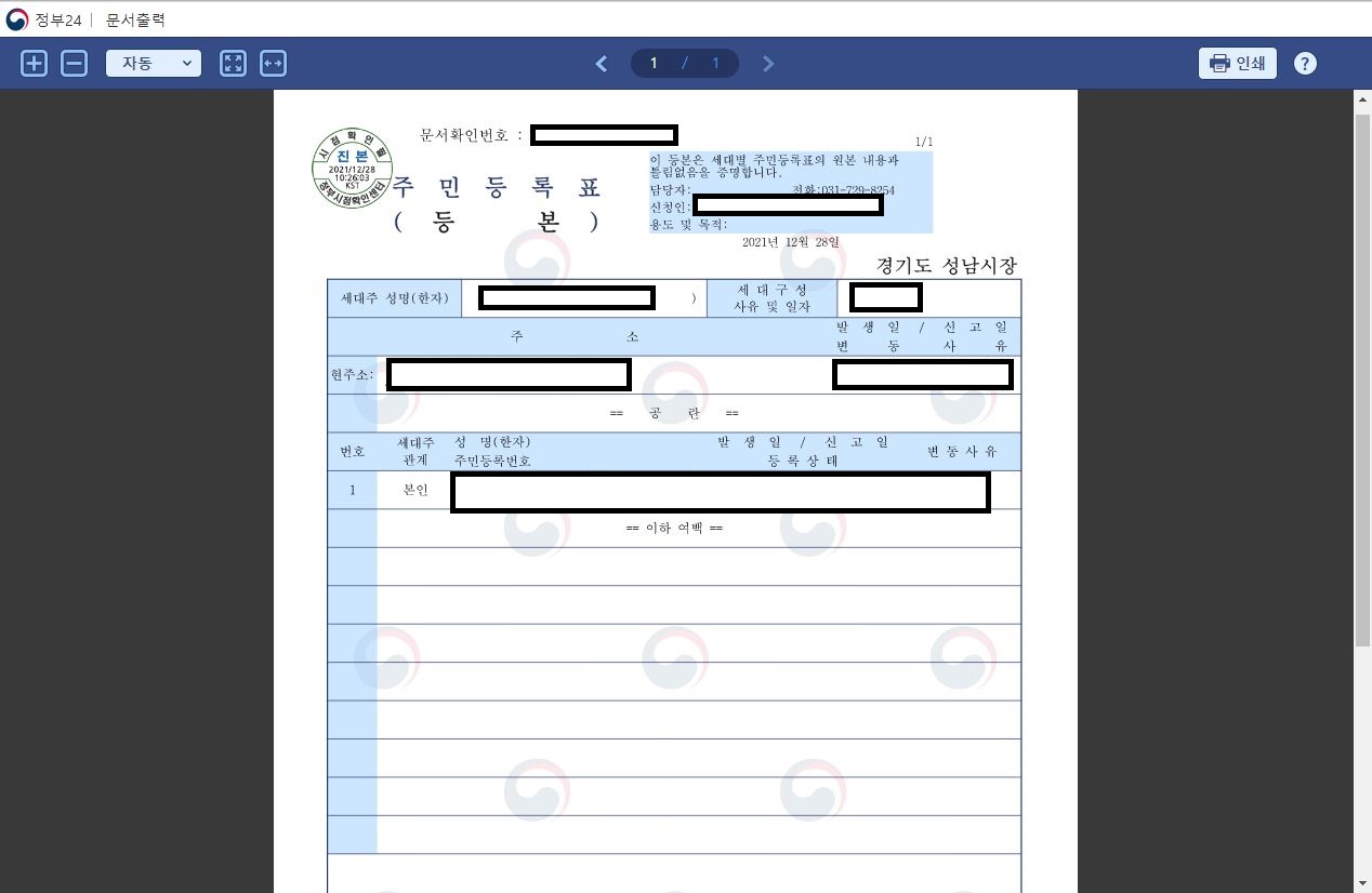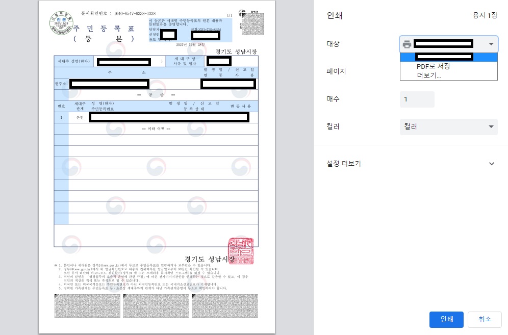 그러면 이와 같이 주민등록등본을 출력할 수 있는 화면이 뜨게 됩니다. 내용이 맞는지 확인하신 뒤 오른쪽 상단에 인쇄 버튼을 클릭해주세요. 컴퓨터에 설치된 프린터로 바로 출력하시는 것도 가능하고 PDF로 저장하는 것도 가능하니 원하시는 방법으로 진행하시면 됩니다.