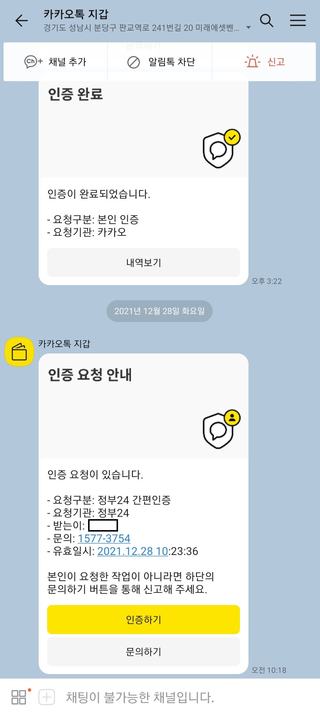 간편인증을 클릭한 후 카카오톡 선택 (물론 다른 방법으로 진행하셔도 됩니다.) 후 이름, 생년월일, 휴대폰번호를 기입하고 인증 요청 버튼을 누릅니다. 그러면 카카오톡 지갑을 통해 인증 요청이 오게 돼요. 노란색 인증하기 버튼을 누르시고 인증 과정을 마치신 뒤 다시 간편인증 로그인 화면으로 돌아와 인증 완료 버튼을 누르시면 됩니다.