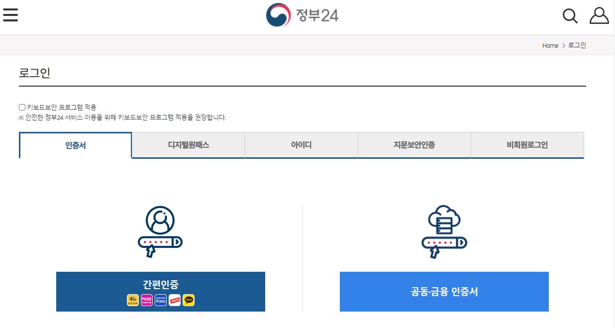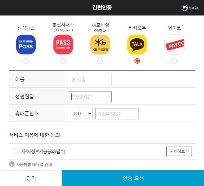 회원가입 후에는 간편인증이나 공동인증서, 금융인증서를 통한 로그인이 가능해요. 저는 간편인증 카카오톡으로 로그인을 진행 해 볼게요.