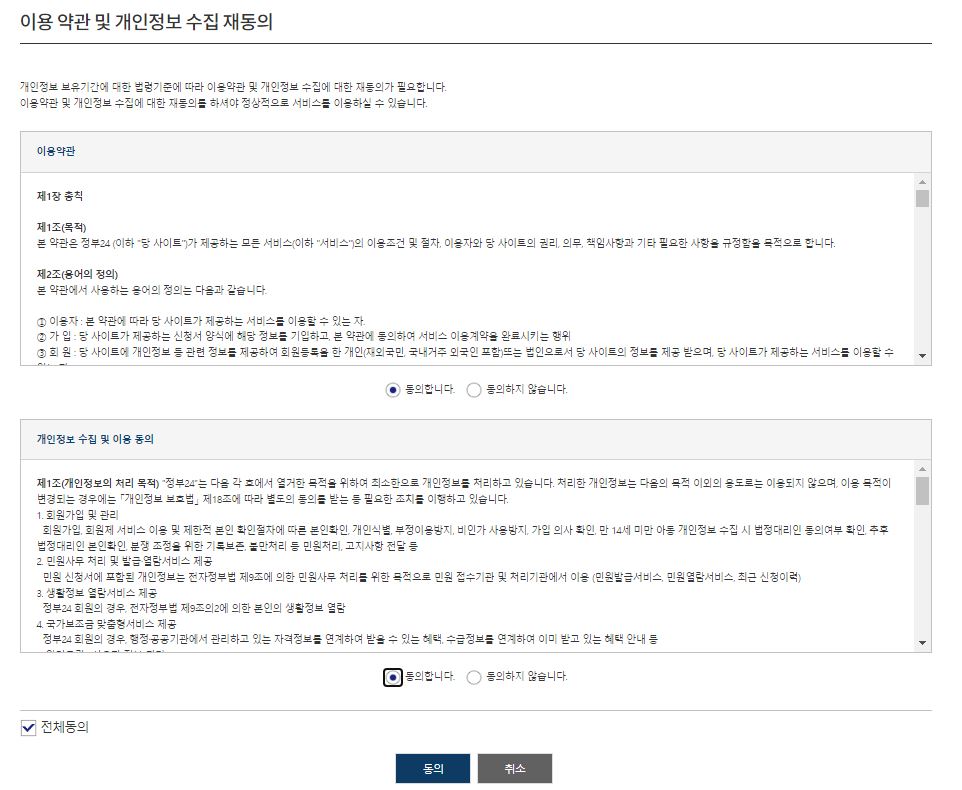 로그인이 완료되면 본격적으로 주민등록등본 인터넷발급 신청 과정에 들어가게 돼요. 먼저 이용 약관 및 개인정보 수집 재동의에 전체동의를 해 주신 뒤 신청하게 됩니다. 주민등록등본 신청시에는 주민등록상의 주소, 발급/선택발급 여부, 수령방법을 선택하게 됩니다.