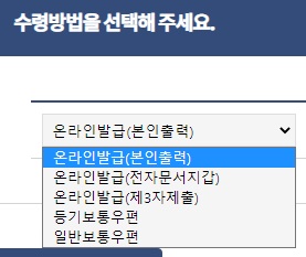 수령방법은 총 다섯가지인데요, 온라인발급 이외에 등기보통우편, 일반보통우편으로 받는 것이 가능합니다. 이번에는 인터넷발급이 목적이니 온라인발급(본인출력)을 선택하고 진행 해 보았어요.