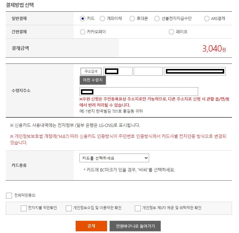 결제방법도 다양하기 때문에 편하게 결제하실 수 있을거에요. 카드, 계좌이체, 휴대폰, 선불전자지급수단, ARS결제뿐 아니라 카카오페이나 페이코를 통한 결제도 가능합니다. 이렇게 결제 창이 뜬다는 것은 등기보통우편이나 일반보통우편으로 받는 경우이기때문에 받으실 주소를 기입하신 뒤 결제 버튼을 누르시고 결제를 진행하시면 돼요.