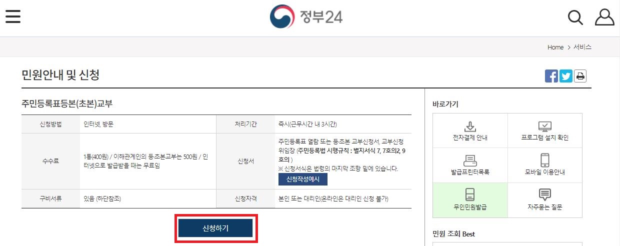 만약 정부24 홈페이지로 접속하셨다면 메인 화면의 자주 찾는 서비스 첫번째 메뉴에서 주민등록등본 아이콘을 발견하실 수 있을거에요. 그 아이콘을 클릭하고 들어가주시면 되구요, 만약 주민등록등본 인터넷발급 이라고 쳐서 들어가셨다면 오른쪽 캡쳐 이미지처럼 바로 이렇게 주민등록등본을 신청할 수 있는 화면이 뜨게 됩니다. 여기서 신청하기 버튼을 클릭 해 주세요.