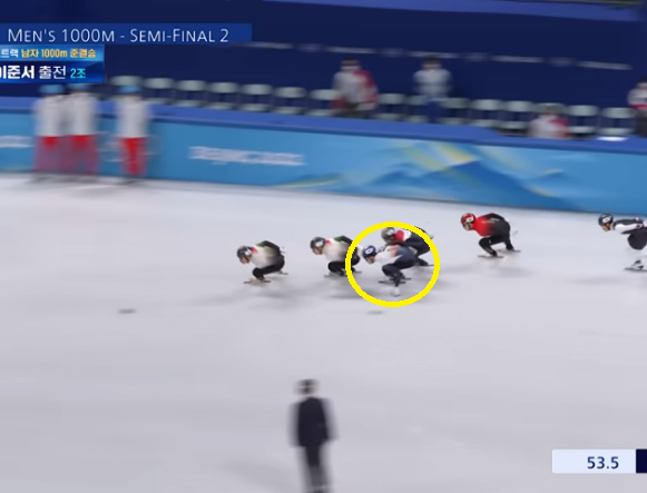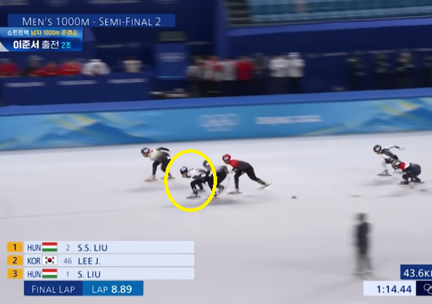 이준서 선수는 초반 4위에서 출발해 깔끔한 인코스 추월로 한 단계 한 단계 올려나갔는데요, 4위에서 3위, 3위에서 2위로 올라서며 두 번째로 결승선을 밟았습니다. 하지만 이준서 역시 패널티 판정. 레인을 변경하면서 반칙을 범했다는 것 이었습니다.