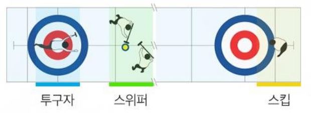 컬링 경기가 진행되면 네 명의 선수는 투구자, 스위퍼, 스킵 으로 나뉘게 됩니다. 투구자는 말 그대로 스톤을 던지는 선수로, 호그라인 전에 스톤을 놓아야 합니다. 스위퍼는 브룸을 이용해서 스톤의 경로와 속도를 조절하는 역할을 하며, 스킵은 팀의 주장으로, 스톤의 위치를 지정하는 등 전략을 세웁니다.
