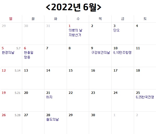 다음은 2022년 6월 입니다. 6월은 평일 20일, 토요일 4일, 일요일 4일, 공휴일 2일, 총 30일 입니다. 매년 쉬는 6월 6일 현충일은 월요일이어서 토, 일요일과 이어서 연휴로 쉴 수 있어서 좋은 것 같네요. 이번에는 또 지방선거가 있습니다. 6월 1일 지방선거가 수요일이기 때문에 그나마 하루 더 쉴 수 있어요. 이번 2022년은 그나마 선거 때문에 이틀이라도 더 쉬어서 다행인 것 같습니다.
