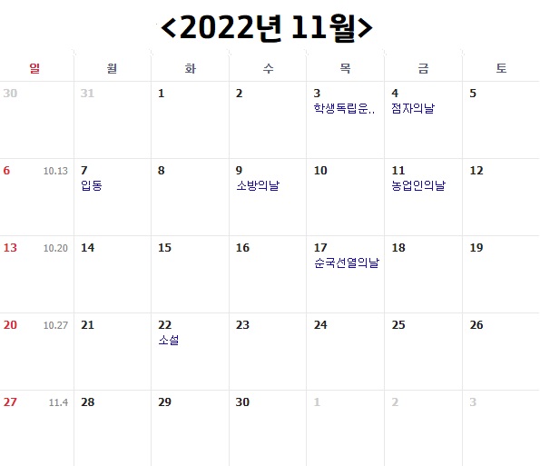 다음은 2022년 11월 입니다. 11월도 휴일 전멸이에요. 평일 22일, 토요일 4일, 일요일 4일로 평일이 빡빡하게 배치되어있는 한 달이죠. 11월에는 원래도 공휴일이 없기 때문에 역시나 쉽지 않은 한 달이 될 것 같습니다.