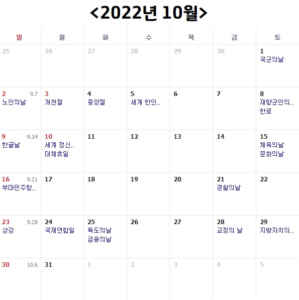 다음은 2022년 10월이에요. 10월은 평일 19일, 토요일 5일, 일요일 5일, 공휴일 2일이에요. 10월 공휴일로는 개천절과 한글날 대체휴일이 있습니다. 개천절인 10월 3일은 월요일이어서 토,일,월 연휴로 쉬실 수 있고, 10월 9일 한글날도 일요일이라 다음날인 10월 10일 월요일이 대체휴일로 지정되어서 역시 연달아 토,일,월 연휴로 쉬실 수 있어요. 2주 연속으로 월요일까지 쉴 수 있어서 좋은 것 같네요.