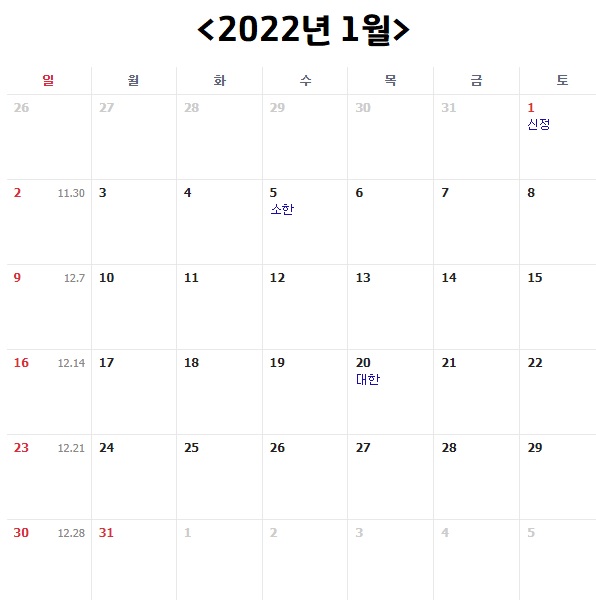 먼저 2022년 1월입니다. 2022년 1월은 총 31일, 평일 20일, 토요일 4일, 일요일 5일, 공휴일 2일로 총 31일 입니다. 공휴일로는 1월 1일 신정과 설날 전날인 1월 31일이 있습니다. 아쉽게도 1월 1일 신정이 토요일이고 신정의 경우 대체공휴일로 따로 지정되지도 않기 때문에 올해는 1월 1일이라고 따로 쉬지는 못할 것 같네요.