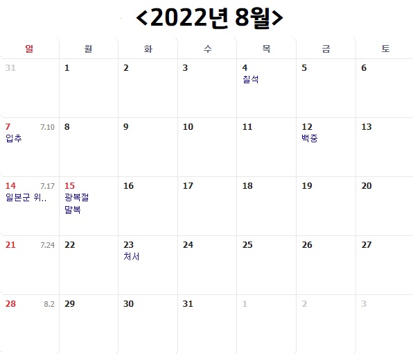 2022년 8월은 평일 22일, 토요일 4일, 일요일 4일, 공휴일 1일, 총 31일이에요. 공휴일은 8월 15일 광복절이고 월요일이어서 토, 일요일과 이어서 쉴 수 있습니다. 2021년에는 8월 15일이 일요일이어서 못쉬었었는데요, 그래서 대신 8월 16일 월요일을 대체공휴일로 지정해서 쉬었었죠. 이번에는 깔끔하게 월요일 쉬면 될 것 같습니다. 평일이 22일이나 되기때문에 8월도 잘 가지 않는 한 달이 될 것 같네요.