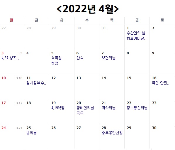 보통 그렇지만 2022년 4월은 조금 힘든 한 달이 될 것 같습니다. 평일이 꽉 차있고 쉬는 날이 하루도 없기 때문이죠. 2022년 4월은 평일 21일, 토요일 5일, 일요일 4일, 총 30일 입니다. 2021년에 이어 공휴일이 하루도 없는 달이네요.