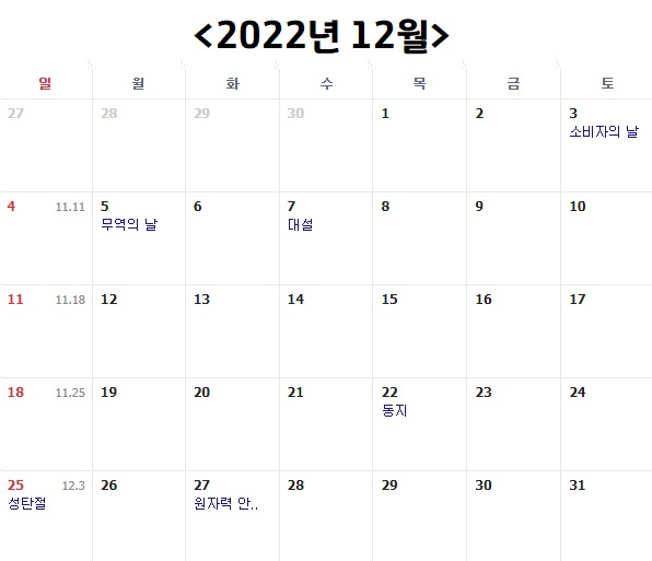 마지막으로 2022년 12월 달력이에요. 슬프게도 2022년은 12월도 공휴일이 전무합니다. 크리스마스인 12월 25일이 일요일이기 때문인데요, 평일 22일, 토요일 5일, 일요일 4일이에요. 2021년에도 크리스마스가 토요일이라 아쉬웠는데 2022년도에도 일요일로 하루 덜 쉬게 되어서 너무 아쉽네요. 크리스마스의 경우에는 따로 대체공휴일 지정이 없기 때문에 11월부터 쭉 힘든 두 달이 될 것 같습니다.