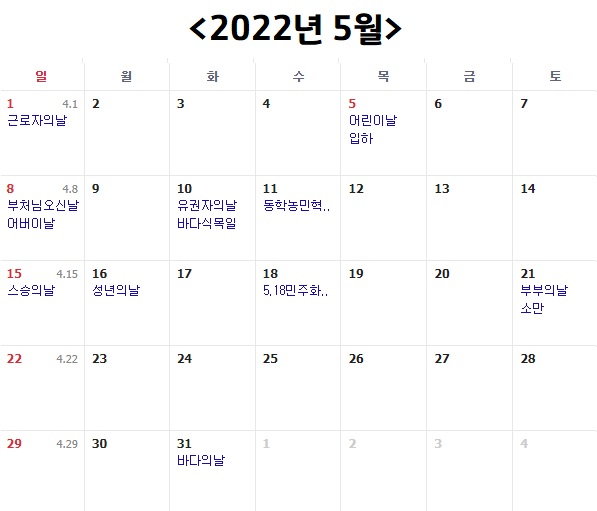 그런데다가 5월 1일 근로자의날도 일요일이에요. 근로자의날은 공휴일은 아니지만 대부분의 회사에서 쉬는 날인데요, 이번 2022년은 근로자의날도 그냥 넘어갈 수밖에 없을 것 같네요.