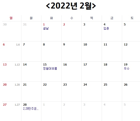 다음은 2022년 2월 입니다. 2022년 2월은 평일 18일, 토요일 4일, 일요일 4일, 공휴일 2일로 총 28일 입니다. 공휴일로는 설날과 설날 다음날이 있어요. 2월 1일이 설날 당일이라 앞뒤로 쉬게 되고 이번에는 토, 일요일과 연결이 되기 때문에 토요일부터 쉬실 수 있으신 분들의 경우 1월 29일 토요일부터 2월 2일 수요일까지 5일간 연휴를 보내실 수 있습니다.