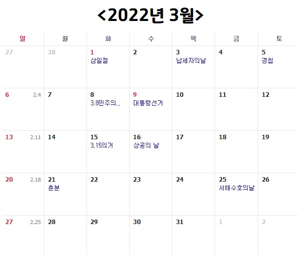 다음은 2022년 3월 입니다. 2022년 3월은 평일 21일, 토요일 4일, 일요일 4일, 공휴일 2일 입니다. 공휴일로는 3월 1일 삼일절과 3월 9일 대통령선거가 있습니다. 3월 1일 삼일절은 화요일이고 3월 9일 대통령선거는 수요일이에요. 대통령선거가 있어 하루 더 쉴 수 있어서 좋은 것 같습니다.