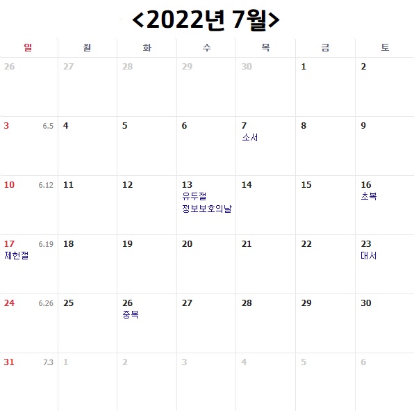 다음은 2022년 7월이에요. 평일 21일, 토요일 5일, 일요일 5일로 총 31일이며 공휴일은 하나도 없이 전멸입니다. 7월에는 여름휴가라도 써서 쉬어주어야 할 것 같습니다.