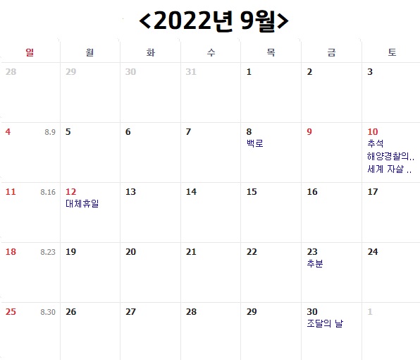2022년 9월은 평일 20일, 토요일 3일, 일요일 4일, 공휴일 3일로 총 30일 입니다. 9월은 추석 연휴가 있는 달이에요. 그런데 또 추석이 토요일에 걸려버렸어요. 다행히 추석의 경우 대체휴일이 지정되기 때문에 9월 12일 월요일 하루가 대체휴일로 지정이 되어서 9월 9일 금요일부터 9월 12일 월요일까지 쉴 수 있습니다.